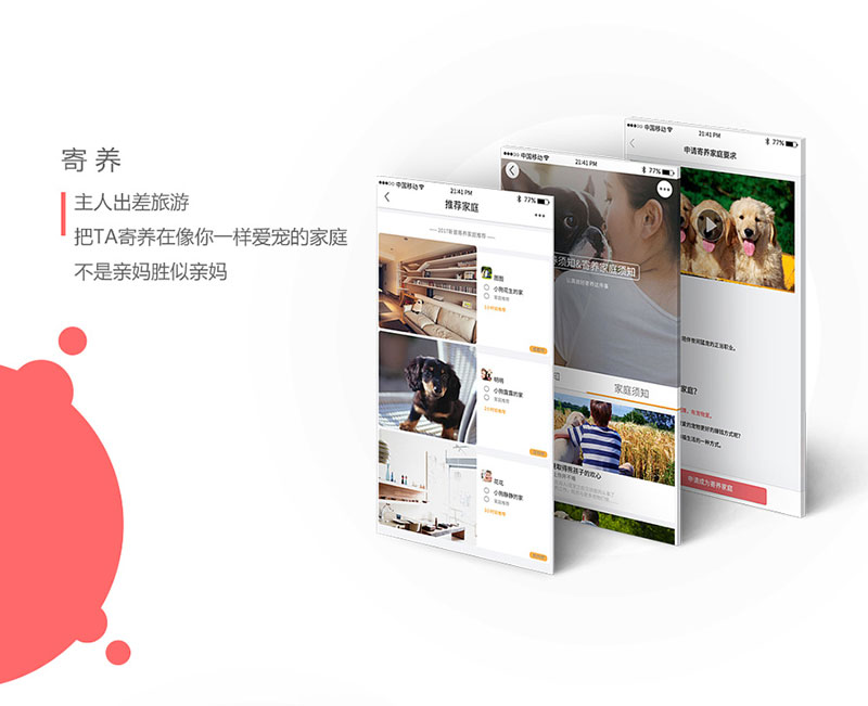 你是否忙于自己的生活不能照顾它?你是否想要继续养它却遭到加入的反对?你是否不想遗弃它又害怕它受到伤害。宠物领养APP给它一个温暖的家。一切服务的前提是得先帮助人们找到属于自己的爱宠,而 “领养” 会是一个好的切入点。
