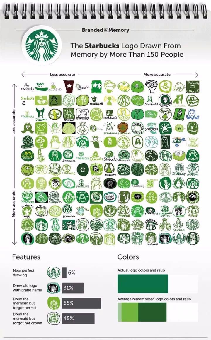 这是国外的“LOGO研究所”做的街头测试,让人们按照自己对辛巴克的记忆画出辛巴克的LOGO,测试结果显示,即使是大家日常生活经常见到的知名品牌,消费者也难复原LOGO原来的样子,这个实验说明,我们看到的东西哪怕稍有复杂的形状和颜色变化,我们就很难再做复原。