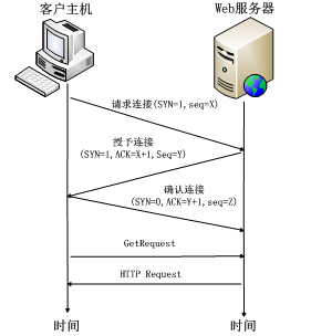 图1 TCP三次握手:数据段互换 Client发送连接请求报文,Server接受连接后回复ACK报文,并为这次连接分配资源。Client接收到ACK报文后也向Server发送ACK报文,并分配资源,这样TCP连接就建立了。前两次握手,是为了保证服务端能收接受到客户端的信息并能做出正确的应答;后两次握手,是为了保证客户端能够接收到服务端的信息并能做出正确的应答。建立完TCP三次握手后,Client就可以和Web服务器进行通信了。 在DoS攻击中,攻击者通过伪造ACK数据包,希望Server重传某些数据包,Server根据TCP重转机制,进行数据重传。攻击者利用TCP协议缺陷,通过发送大量的半连接请求,耗费CPU和内存资源。实现方式如下图: