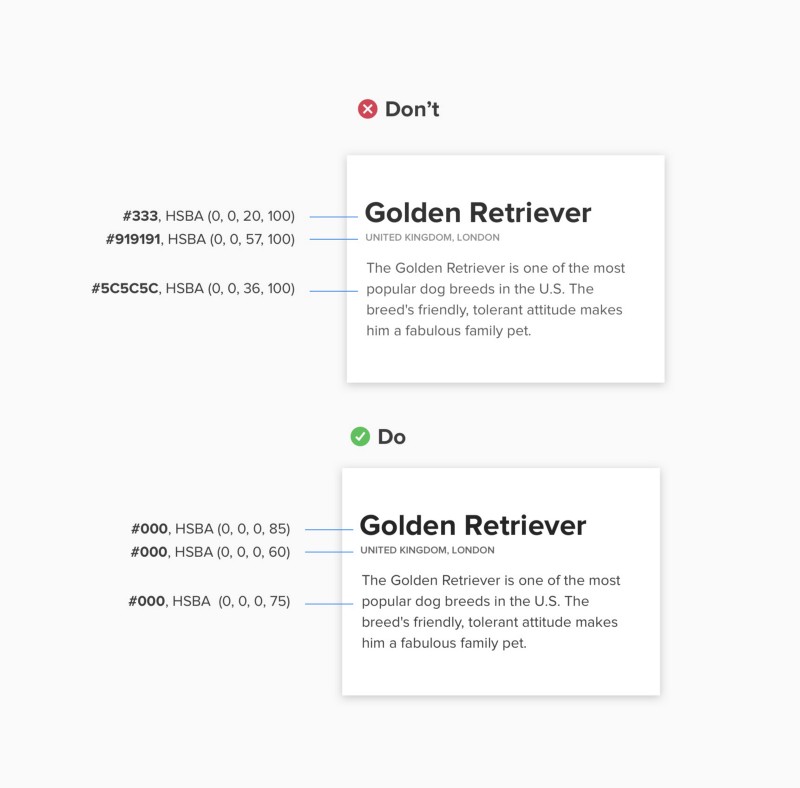 我们都知道使用黑色文字颜色(#000)会给读者眼睛造成疲劳,因此我们的替代方案是用比较暗的颜色。使用不同透明度的黑色作为解决方案,而不是去用复杂的十六进制颜色值。