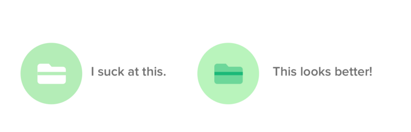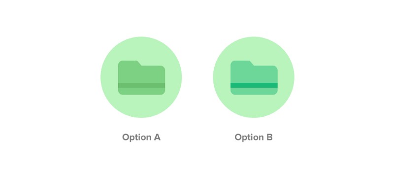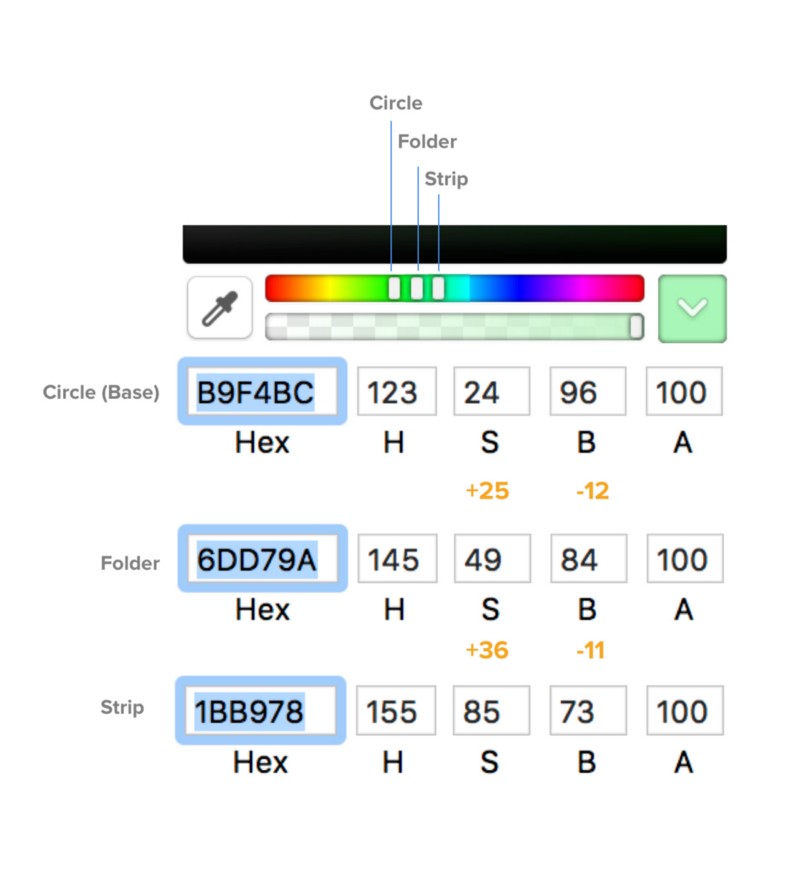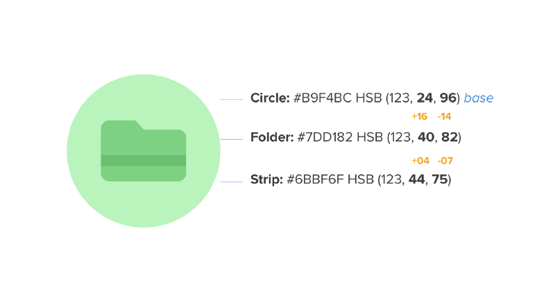 实际上有两种方法,我们可以看到,两个选项都有相同的基础颜色#B9F4BC(圆圈背景),但在文件夹和条带颜色上有不同。在我们开始的时候,请记住第一个数字对应于色相,其次是饱和度,最后是亮度。